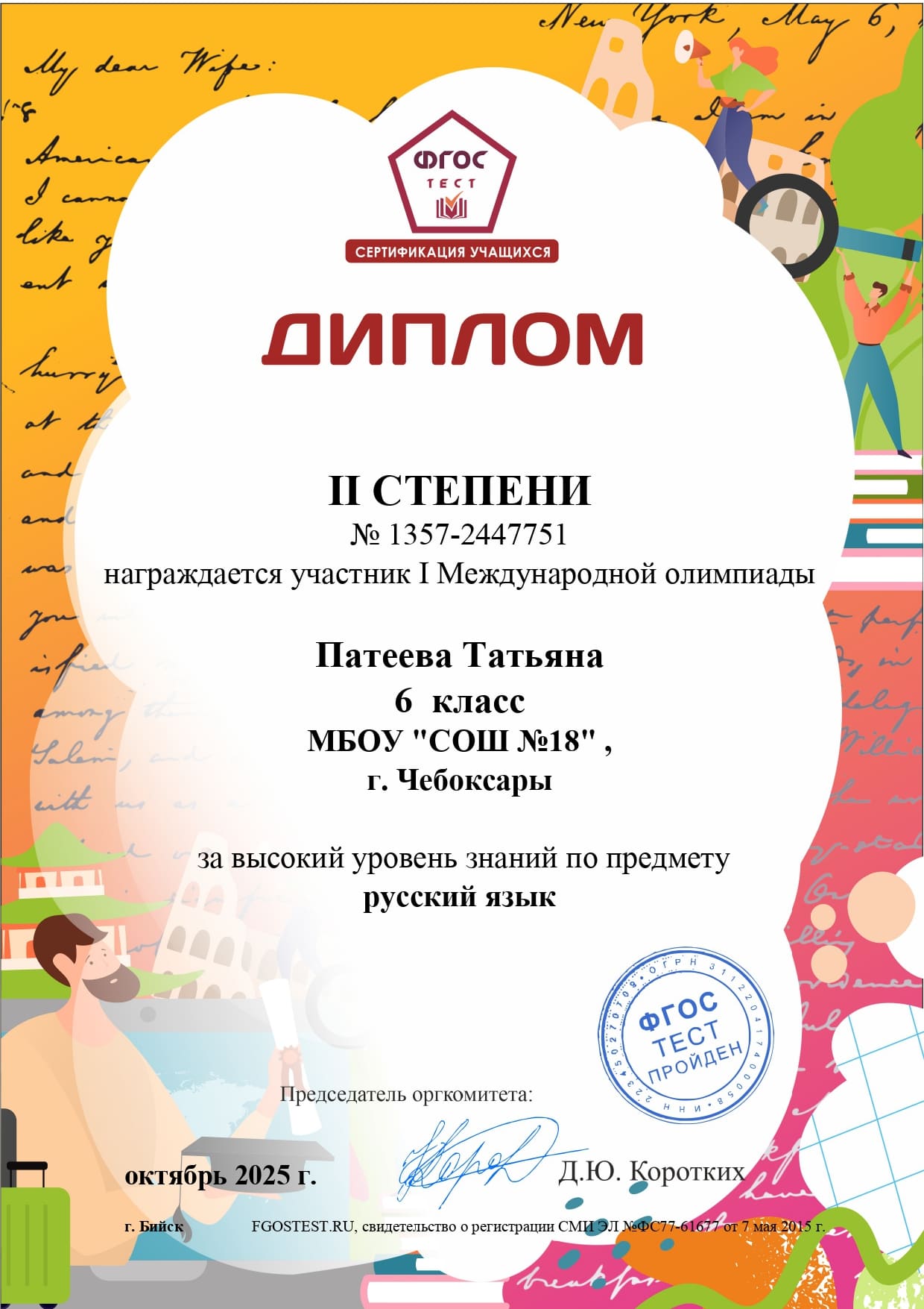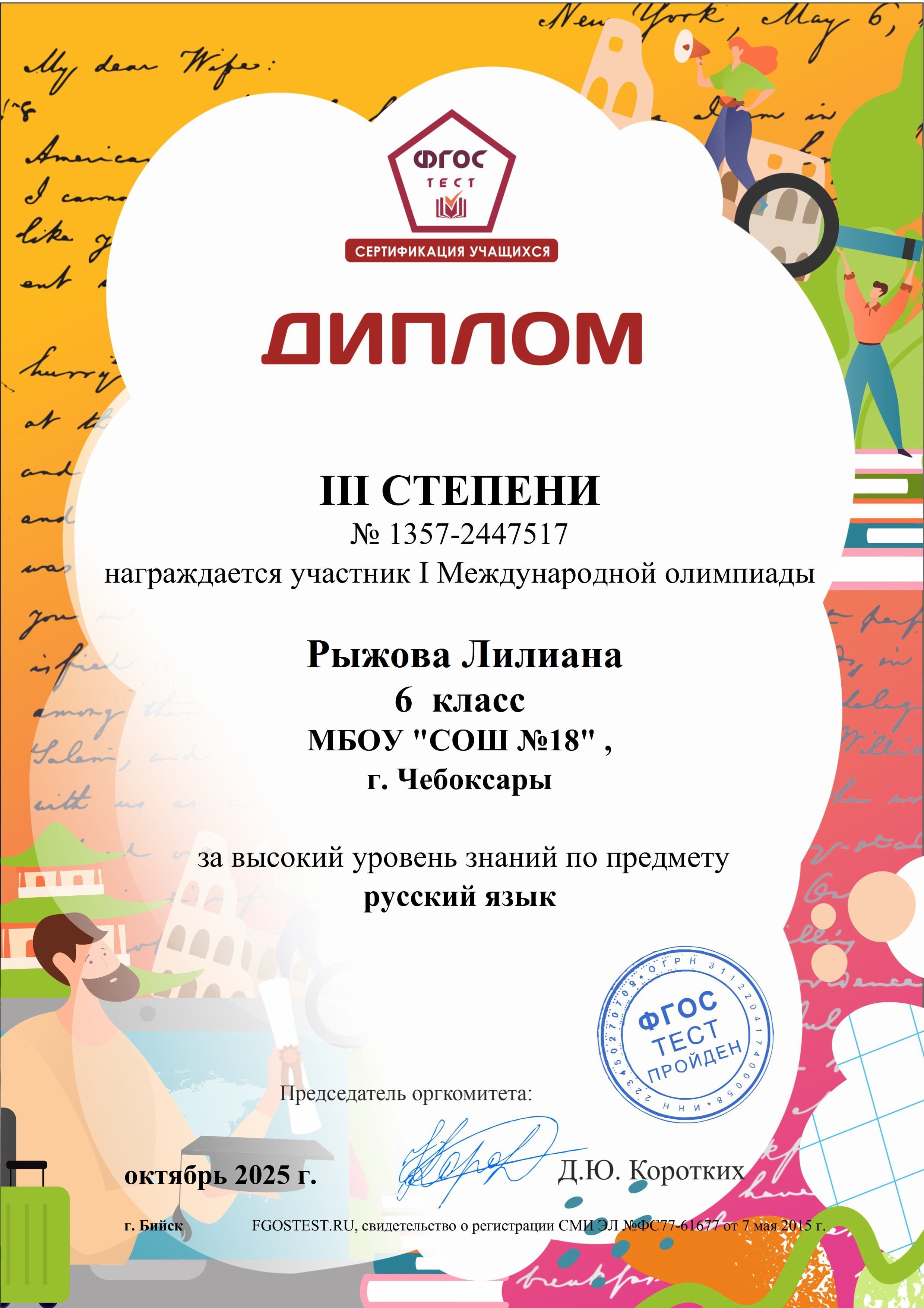 Поздравляем призеров дистанционной олимпиады , проведенной Центром дистанционной сертификации учащихся «ФГОСТЕСТ». Вопросы заданий составлены с учетом требований ФОП и обновленных ФГОС: Лукину Я., Головлеву П., Патееву Т., Рыжову Л. (рук. Федорова Г.Д.)